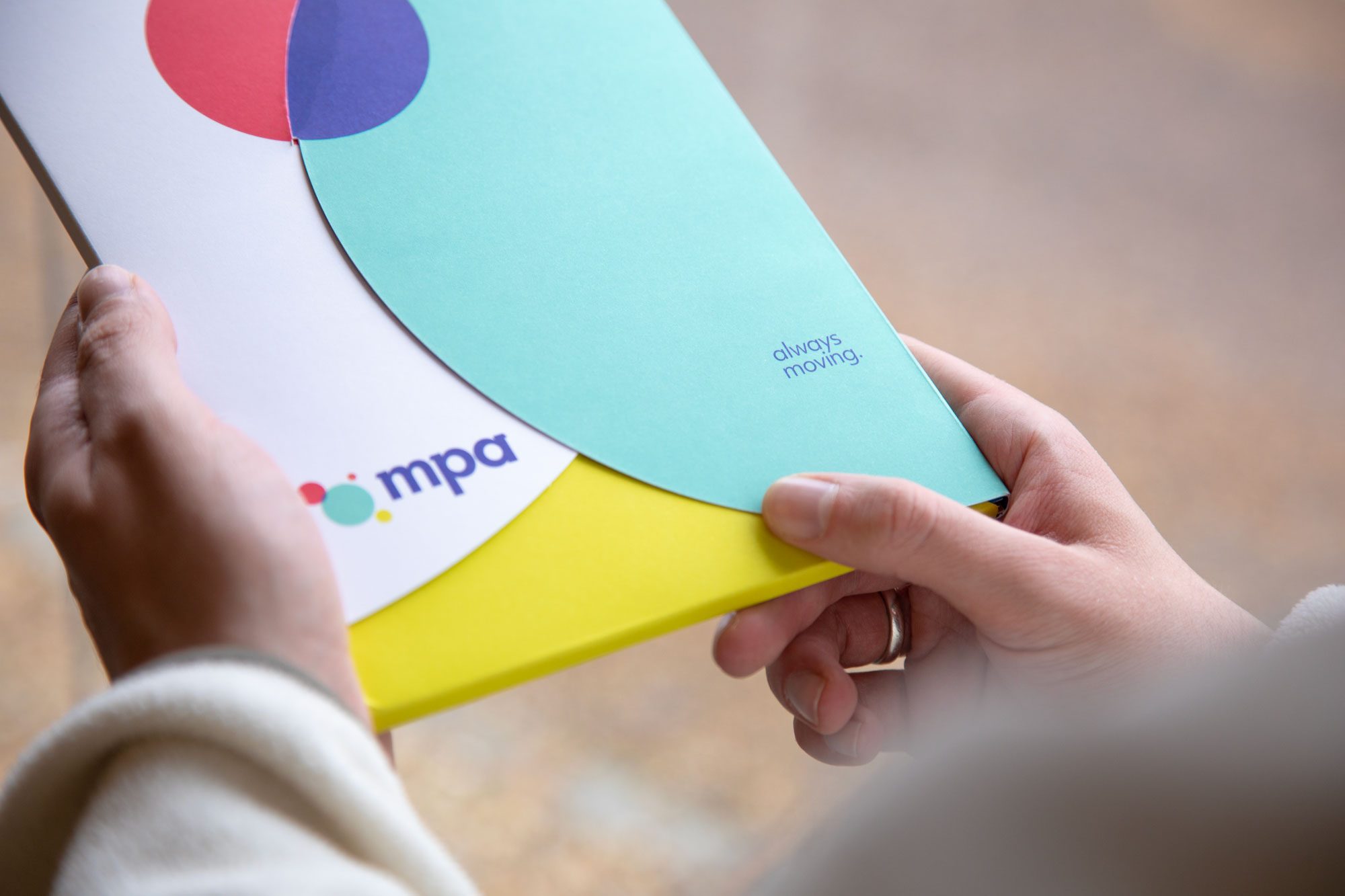We were aware the new logo and strapline needed to reflect the innovation that MPA looked to promote, and to do it without resorting to clichés. Basically, a lightbulb representing innovation wasn’t going to cut it. Therefore, through several stages of development, we came to create a logo consisting of four circles – we refer to these as molecules – and they represent the four core values of MPA as a business. These are consistent in their shape and colour, but can flex and adapt in structure to reflect how MPA align to the needs of their clients. This adaptable icon was then coupled with the MPA wordmark; these three letters, and the way they are aligned, are MPA’s fixed identity; never changing, unfaltering and solid, they are the foundation of MPA’s service.